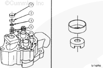 Install the large diameter of the valve mandrel, Part Number 3376012, (in DFC pressure valve fixture, Part Number 3376011), through the locating plate into the pressure limit valve bore in the pump body.